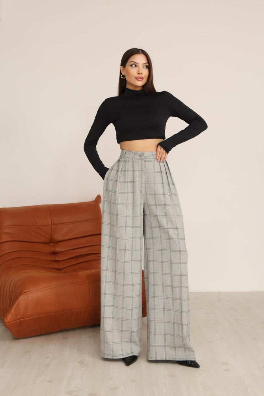Modern tarzıyla öne çıkan bu ekoseli palazzo pantolon, konfor ve şıklığı bir arada sunar.