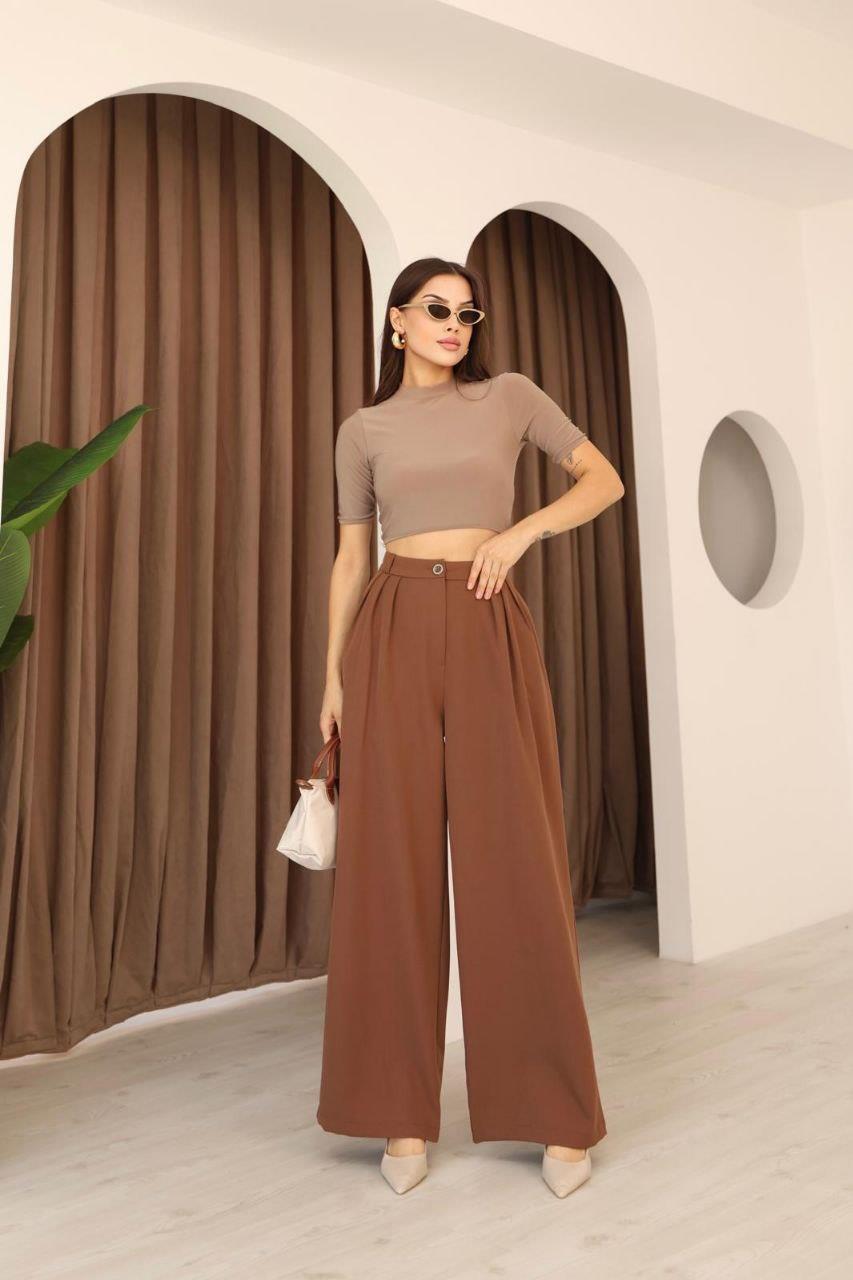 Yüksek Bel 3 Pilili Palazzo Pantolon – Bol Paça, Kahverengi | Günlük & Şık Kombinler İçin