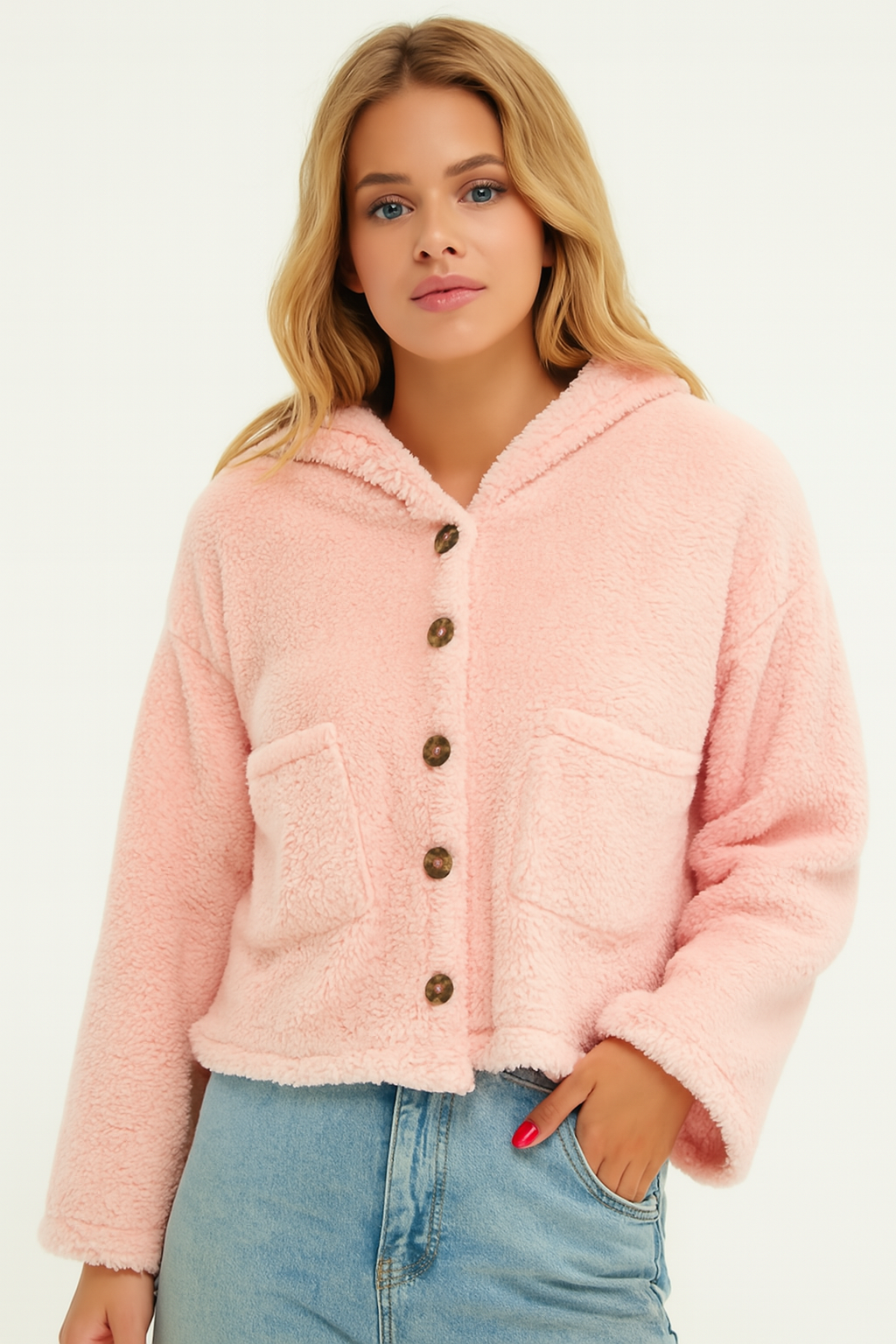 - Kumaş: Sherpa peluş (polyester karışımlı) - Renk: Pembe - Stil: Oversize, rahat kesim - Detaylar: Kapüşonlu, düğmeli, cepli - Mevsim: Sonbahar / Kış - Kombin önerisi: Jean pantolon, bot, gold aksesuar