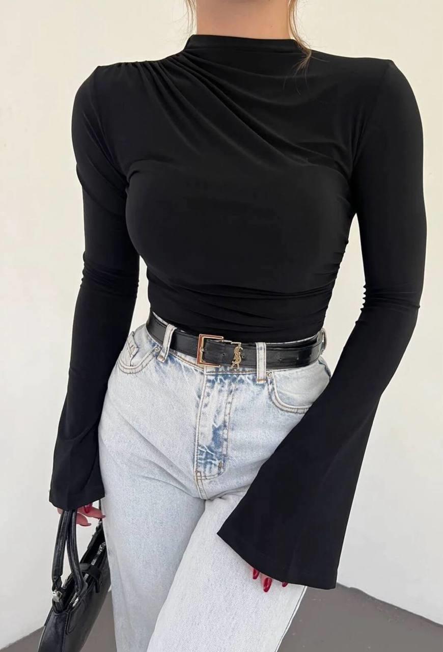 Modern kadının stilini yansıtan bu siyah uzun kollu bluz, yüksek yakası ve balon kol detaylarıyla hem zarif hem güçlü bir duruş sunar. Yumuşak dokulu kumaşı sayesinde gün boyu konfor sağlar. İster jean ile günlük kombinlerde, ister kumaş pantolonla ofis stilinde kullanabileceğiniz çok yönlü bir parçadır.