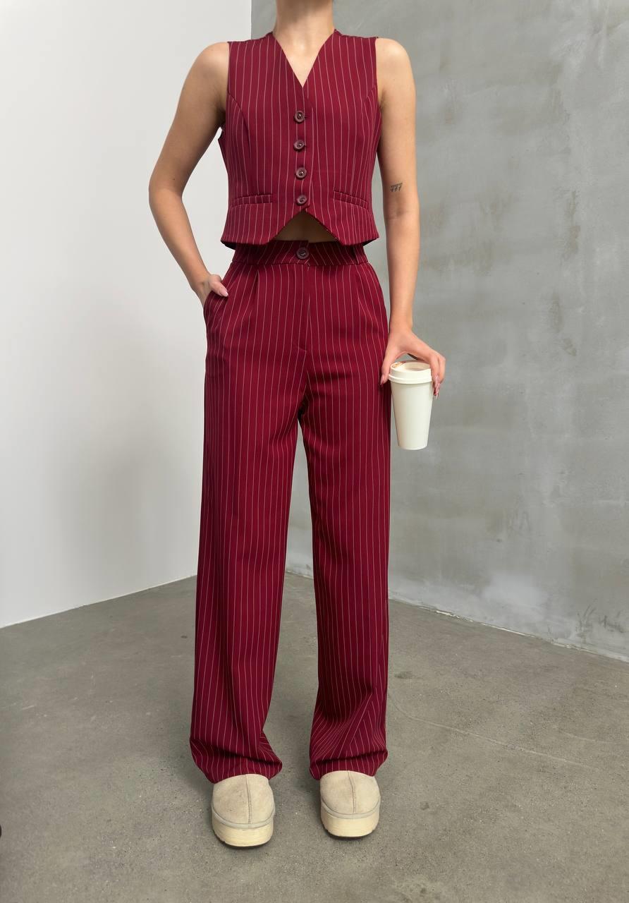 Bu Bordo çizgili iki parça takım, güçlü ve zarif görünmek isteyen kadınlar için tasarlandı. Yüksek bel, dökümlü palazzo pantolon ve ön düğmeli crop yelek detayıyla hem ofis şıklığına hem sokak stiline mükemmel uyum sağlar.