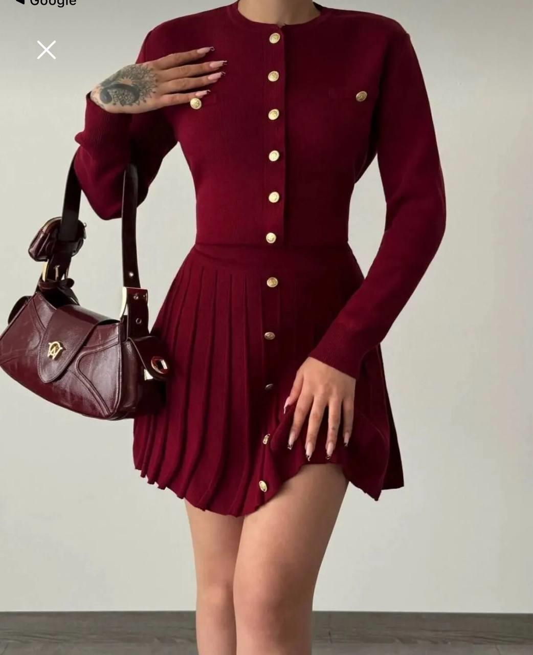 Zarif ve modern tasarımıyla öne çıkan triko kumaş , gardırobunuzun en şık parçalarından biri olacak. Ön kısmında yer alan altın tonlu düğmeler ve pileli etek detayı sayesinde hem klasik hem de modern bir stil sunar.