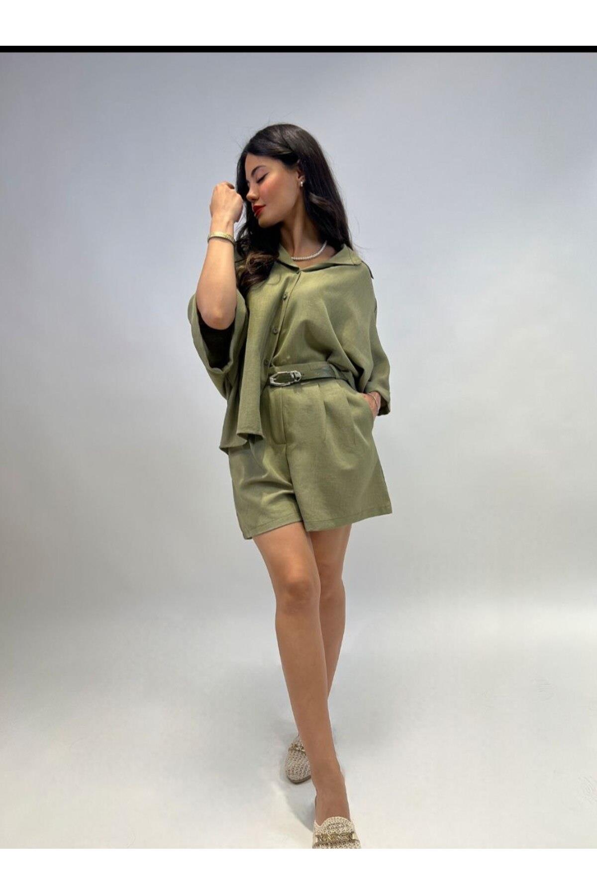 KADIN KETEN ŞORTLU GÖMLEKLİ ALT - ÜST KEMER DETAYLI TAKIM