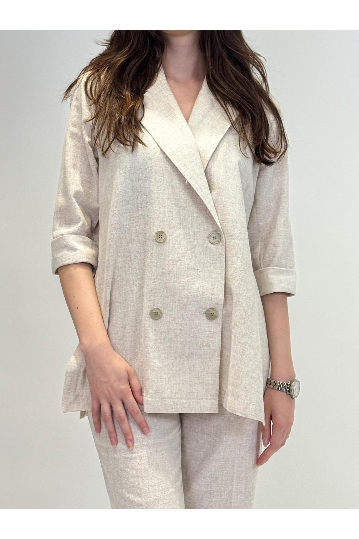 - Orta kalınlıkta keten kumaştan üretilmiş, mevsim geçişlerinde ideal konfor sunar.; - Kutusuz olarak tasarlanmıştır; kolayca saklanabilir ve taşınabilir.; - Tekli paket içeriği ile pratik kullanım sağlar.; - Yıkama talimatlarına uygun şekilde bakım yapıldığında uzun ömürlüdür.; - %100 keten materyali sayesinde nefes alabilen yapısıyla gün boyu rahatlık sunar.; - Düğmeli kapama şekliyle şık ve kullanışlı bir görünüm kazandırır.; - Basic silueti ile her tür kombinle uyum sağlayacak temel parça olma özelliği taşır.; - Young koleksiyonuna ait bu ceket, genç tarza sahip kadınların gardırobunda yerini almayı bekler.; - Düz kesimi sayesinde vücut hatlarını nazikçe sararak zarif bir duruş sergiler.; - Kruvaze yaka detayı modern ve sofistike bir hava katarken, düğme detayları estetik bir dokunuş ekler.; - Cepsiz tasarım hem minimalist hem de fonksiyonel kullanım imkanı sunar.; - Kemersiz yapısıyla basitlikten yana olanların tercihi olurken, herhangi bir aksesuarla da zenginleştirilebilir.; - Tüm sezonlarda rahatlıkla giyilebilen bu ceket, mevsimsel geçişlerde idealdir.; - Sürdürülebilirlik detayı bulunmayan bu ürünün üretiminde doğaya zararlı malzemeler kullanılmamıştır.; - Astarsız oluşu hafifliği arttırarak gün içindeki hareket özgürlüğünü maksimize eder.; - Günlük ortamlarda konforlu ve şık görünmenizi sağlar; işten arkadaş buluşmasına kadar geniş kullanım alanına sahiptir.; - Ek özellikleri arasında yıkama sonrasında bile formunu koruyabilme yeteneği sayesinde dayanıklılığı ön plandadır.; - Keten karışımlı dokuma tipiyle lüks hissiyatını günlük yaşama taşıyan bu ceket, smart casual tarzının vazgeçilmez parçasıdır.; - Genç yaş grubuna hitap eden dinamik ve trend odaklı tasarım anlayışıyla genç kadınların beğenisini kazanır.; - Slim fit kalıbıyla modern kesimi vurgulayan bu ceket, vücut hatlarını nazikçe sararak feminen siluet oluşturur.; - Orta boy seçeneğiyle farklı boylardaki kullanıcılar için idealdir; ne çok kısa ne de çok uzun olup dengeli bir oturuşa sahiptir.; - Dokuma kumaş tipi sayesinde dayanıklılık ve kaliteyi ön plana çıkartırken aynı zamanda estetik görünümünden ödün vermez.; - TR menşeli olmasıyla yerel üretim avantajlarından faydalanmanızı sağlar; kalite standartlarına uygun şekilde üretilmiştir.